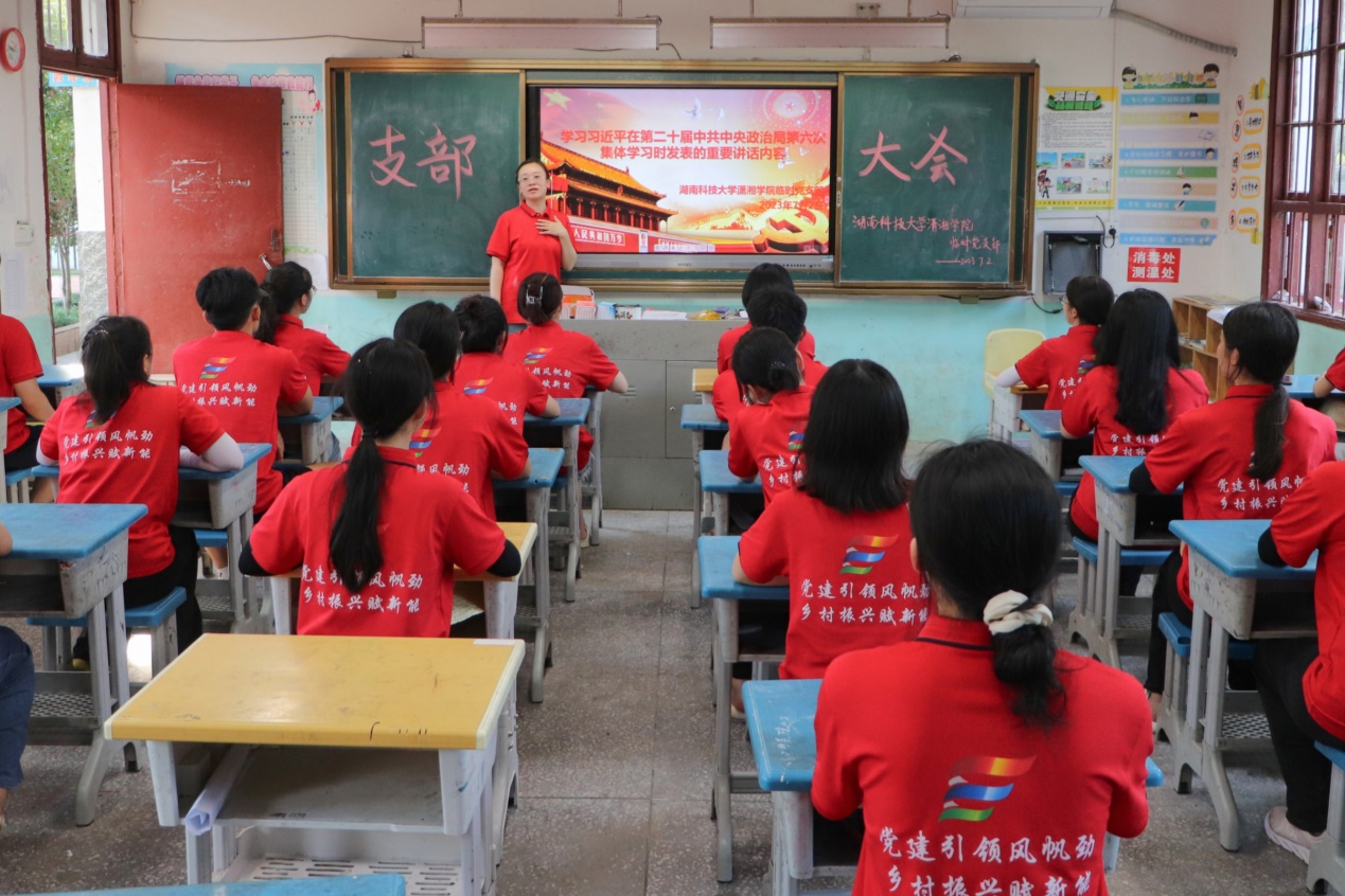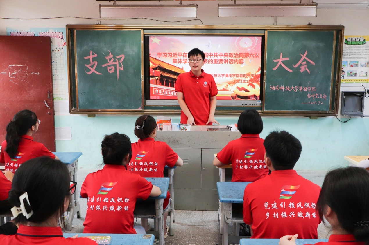 为深入学习贯彻习近平新时代中国特色社会主义思想,充分发挥党组织战斗堡垒和党员先锋模范作用,努力将学院学生培养成为担当民族复兴大任的时代新人,7月2日下午,BEAT365官网于湖南省怀化市通道县木脚完全小学观看习近平在第二十届中共中央政治局第六次集体学习重要讲话内容视频。学院暑期“三下乡”实践团临时党支部全体成员共同观看。