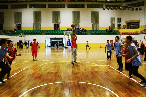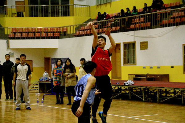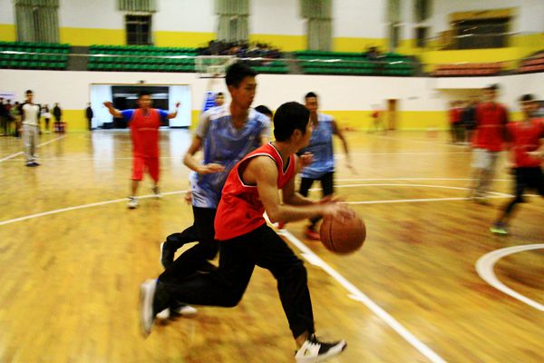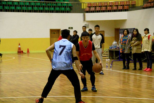 四队队员都早早来到比赛场地热身,随着裁判一声哨响,他们开始了对冠军的抢夺之战。场上首场对决在身着蓝色球衣的体育部广告部战队与一身红色球衣的志愿团心理部战队之间展开。开赛二十分钟,场上比分已初步拉开,红队以绝对优势领先蓝队11分,蓝队不甘示弱奋起直追,五号球员快攻进球夺得2分,七号球员与队员互相配合成功上篮两次,现场观众喝彩阵阵。随后,比赛进入高潮,蓝队连续冲抢前场篮板,二次进攻屡屡得手,一举逆转场上形式,并将比分优势持续到终场,最终蓝队体育部广告部以36:29的成绩完胜红队志愿团心理部。