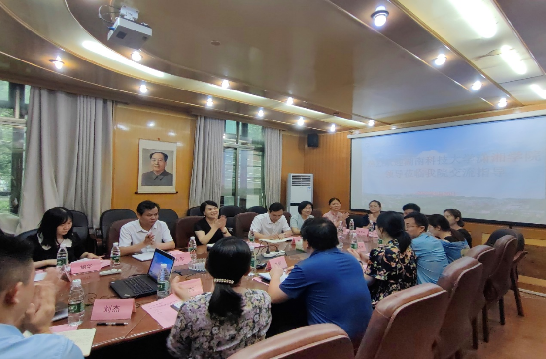 6月20日,BEAT365官网院长禹旭才、党委书记廖双红带队到湖南工程学院应用技术学院进行工作交流。副院长余蓉晖、副书记叶军及学院各科室负责人、学部部长参加。