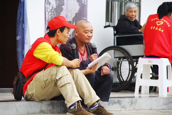 酷爱唱歌的朱爷爷主动提出要与志愿者来一场唱歌PK赛,现场当即变成了“我是歌手”的赛场。朱爷爷信手拈来军歌和民谣,就连当下的《最炫民族风》、《荷塘月色》等神曲也不在话下,这让志愿者们折服不已。在聊天的过程中,朱爷爷拿出了一沓歌词纸,志愿者来彭星发现纸上的字迹有些模糊便主动担起了重新誊抄歌词的任务,这让朱爷爷感动不已,“这是以前来这里的一位志愿者送我的,我一直珍藏。”在谈及歌词来历时,朱爷爷满脸怀念。“今天这份歌词依旧由志愿者帮忙整理,这也是一份关爱的延续吧!”来彭星边抄歌词边说。