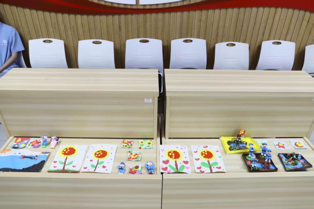 舞台周边,为期10天的实践成果展同样吸睛:绘画作品《万楼》以童趣笔触勾勒家乡风貌,简笔画描绘纯真想象;红色手工作品区,孩子们制作的党旗、红军小战士模型等匠心独具,稚嫩的文字卡片上写满对革命先辈的敬意。一幅幅作品、一件件手作,凝结着“三下乡”活动中孩子们的成长印记,也展现了实践团“以美育人、以文化人”的扎实成效。